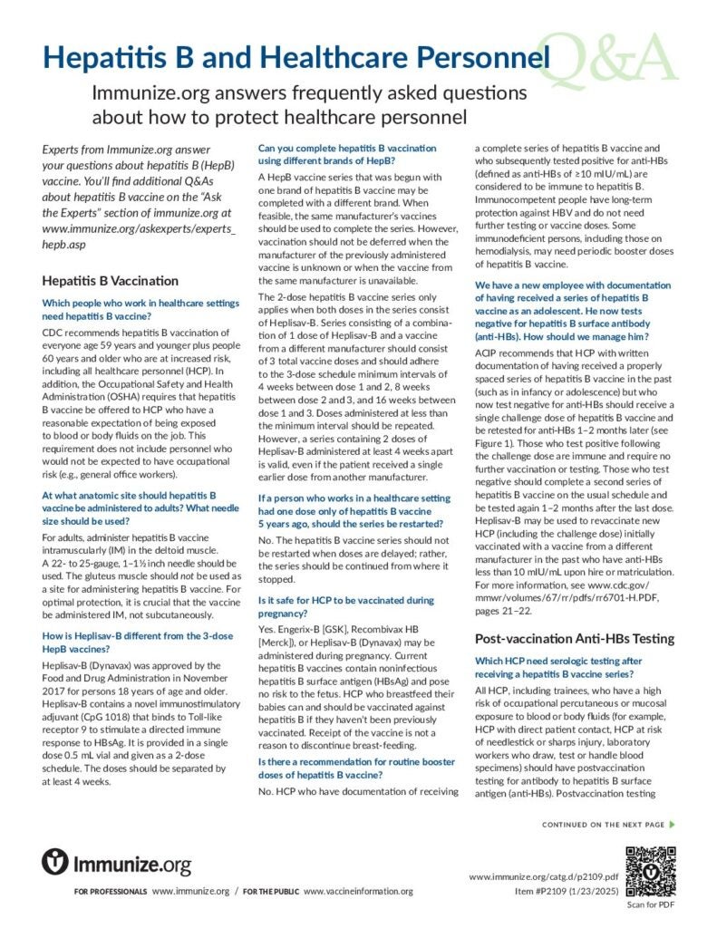 Answers to questions about protecting healthcare personnel from hepatitis b including vaccination and booster recommendations, post-exposure prophylaxis guidelines, hepatitis b triple panel screening, and frequency of hepatitis b testing.