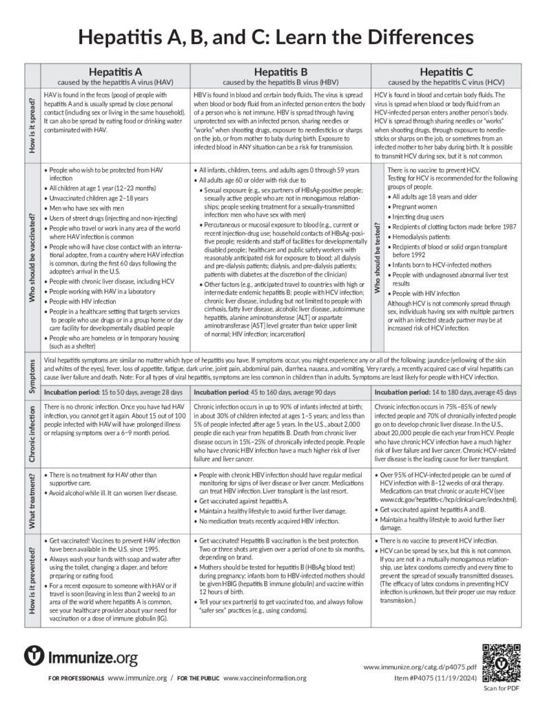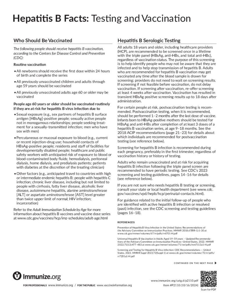 The one-page printable resource to share with adult patients. Describes the CDC-recommended triple panel blood screening test for hepatitis B and the need for hepatitis b vaccination for all adults