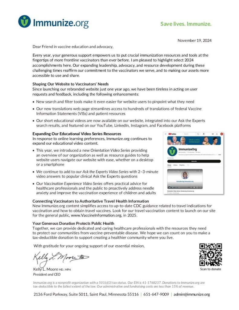 Immunize.org is an award-winning 501(c)(3) nonprofit organization, headquartered in Saint Paul, Minnesota, with more than 30 years of experience working tirelessly to make sure that healthcare professionals and the public are up to date on every aspect of vaccination.