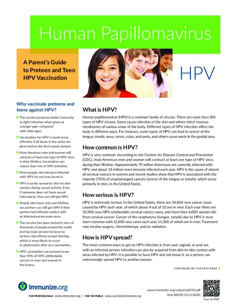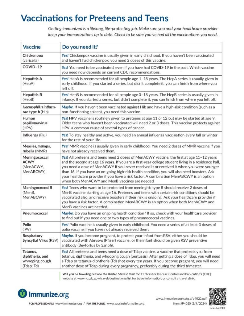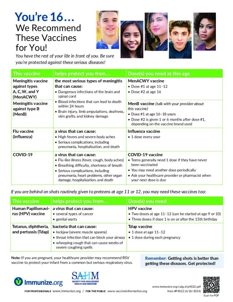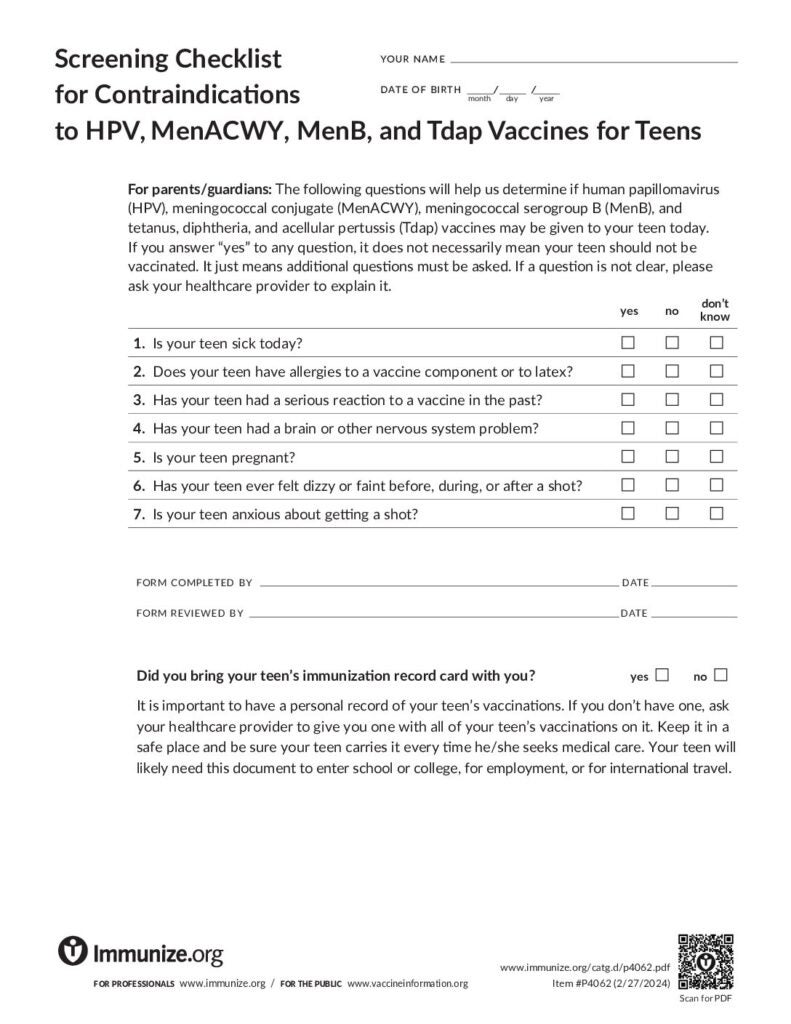 Customizable resources to help educate parents and teen patients on the four recommended immunizations for adolescents.