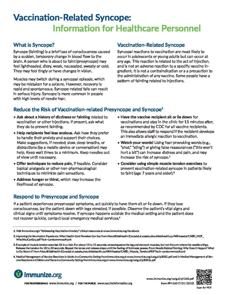 This 1-page handout for healthcare personnel describes how syncope (fainting) sometimes occurs around vaccination, how practitioners can reduce the risk of occurrence, and how to respond if it does occur, plus includes useful resources