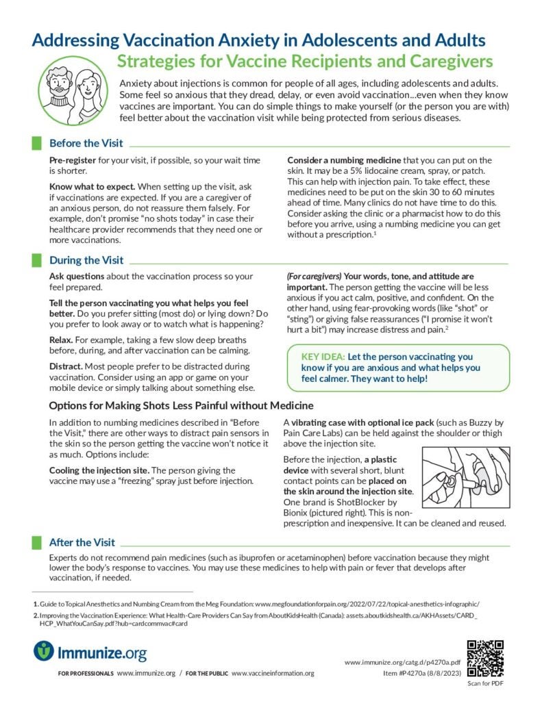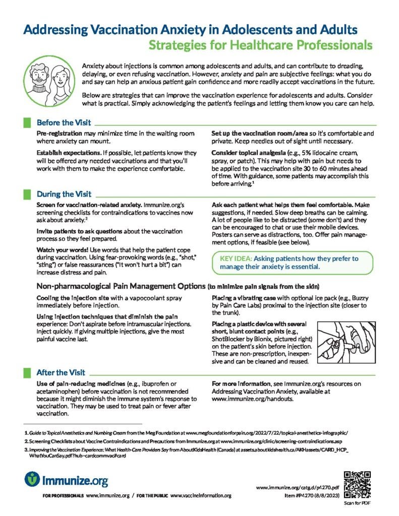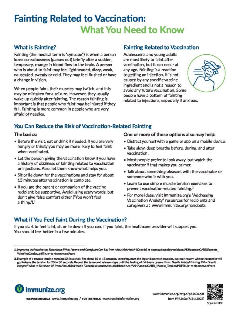A 1-page handout for patients and caregivers describes symptoms of fainting (syncope), how it can occur around vaccination, how to reduce the risk of vaccination-related fainting, and what to do if someone faints during vaccination