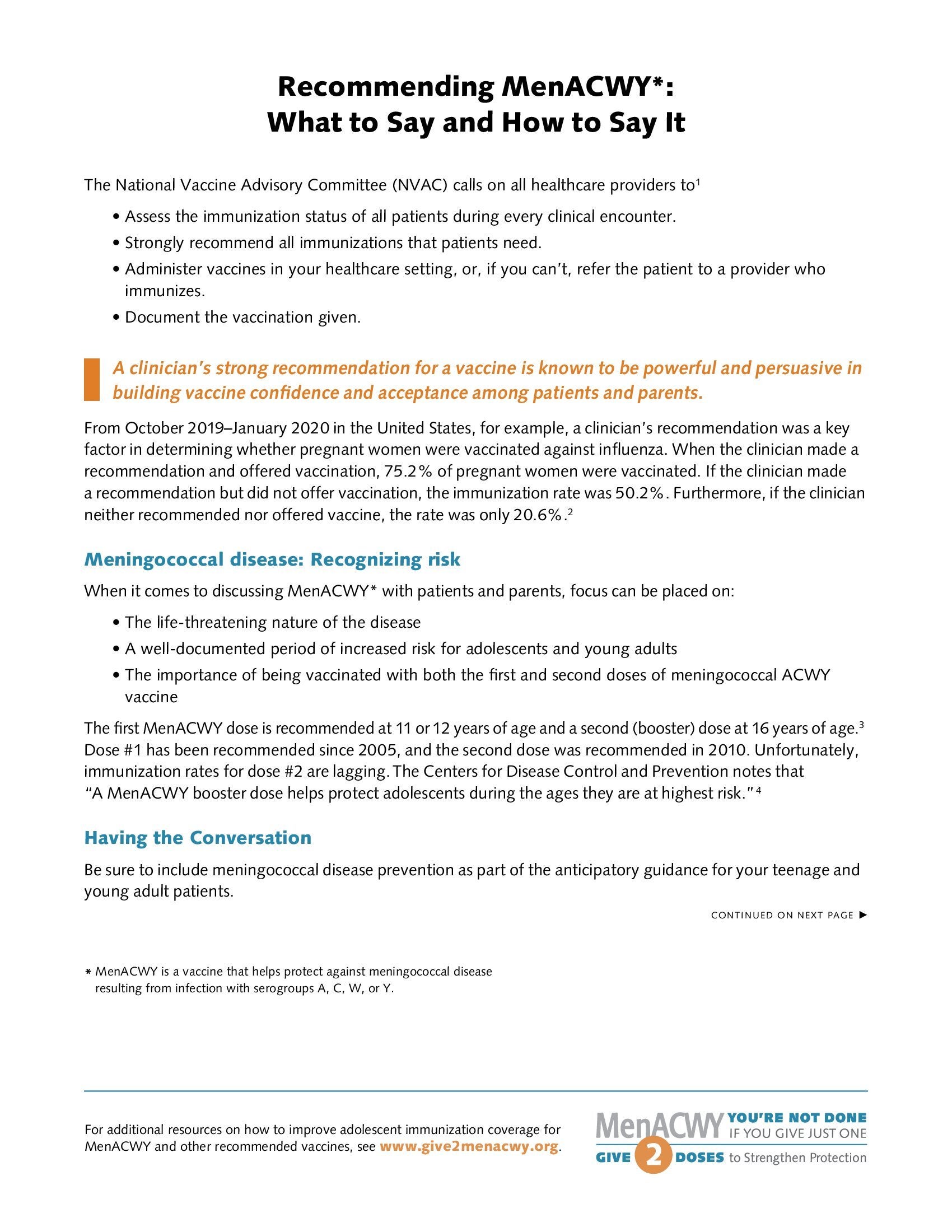Talking points and communication strategies for recommending MenACWY vaccine.