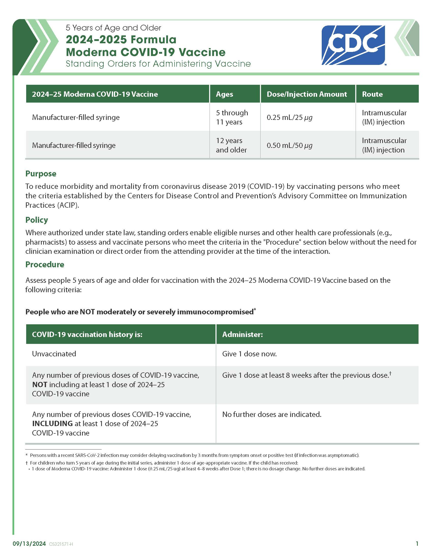 CDC’s form: “5 Years of Age and Older 2024–2025 Formula Moderna COVID-19 Vaccine Standing Orders for Administering Vaccine”
