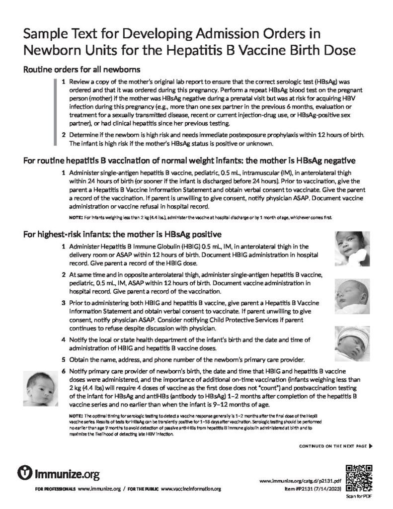 This document gives sample text for admission orders for hepatitis B vaccine birth dose in a newborn nursery