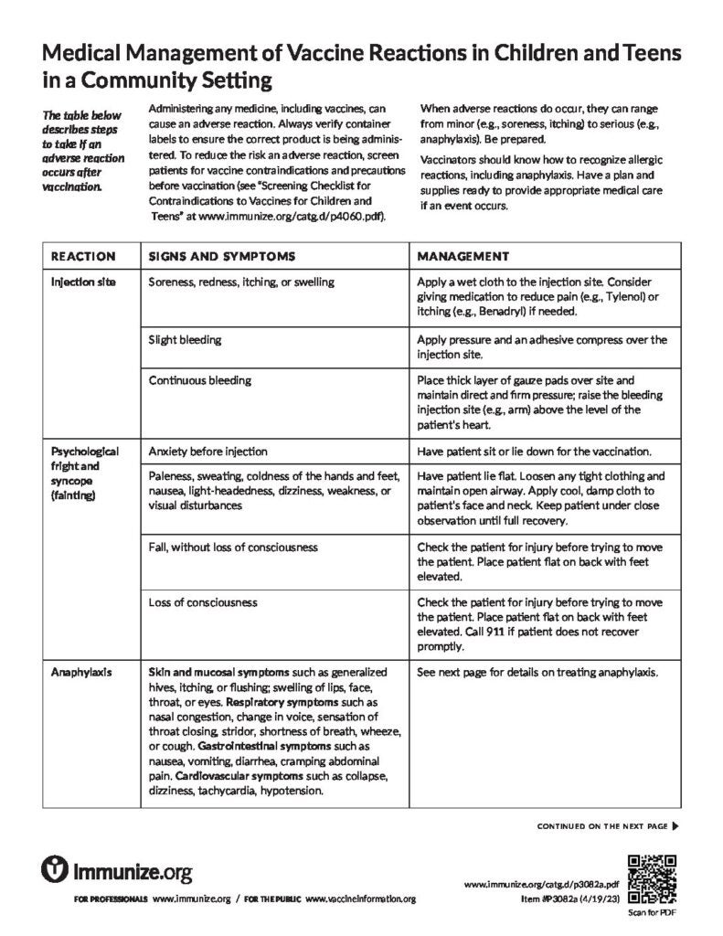 Table describes procedures to follow if various reactions occur in children and teens, includes supply list