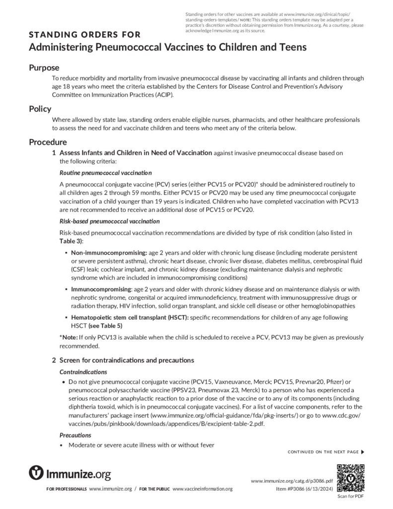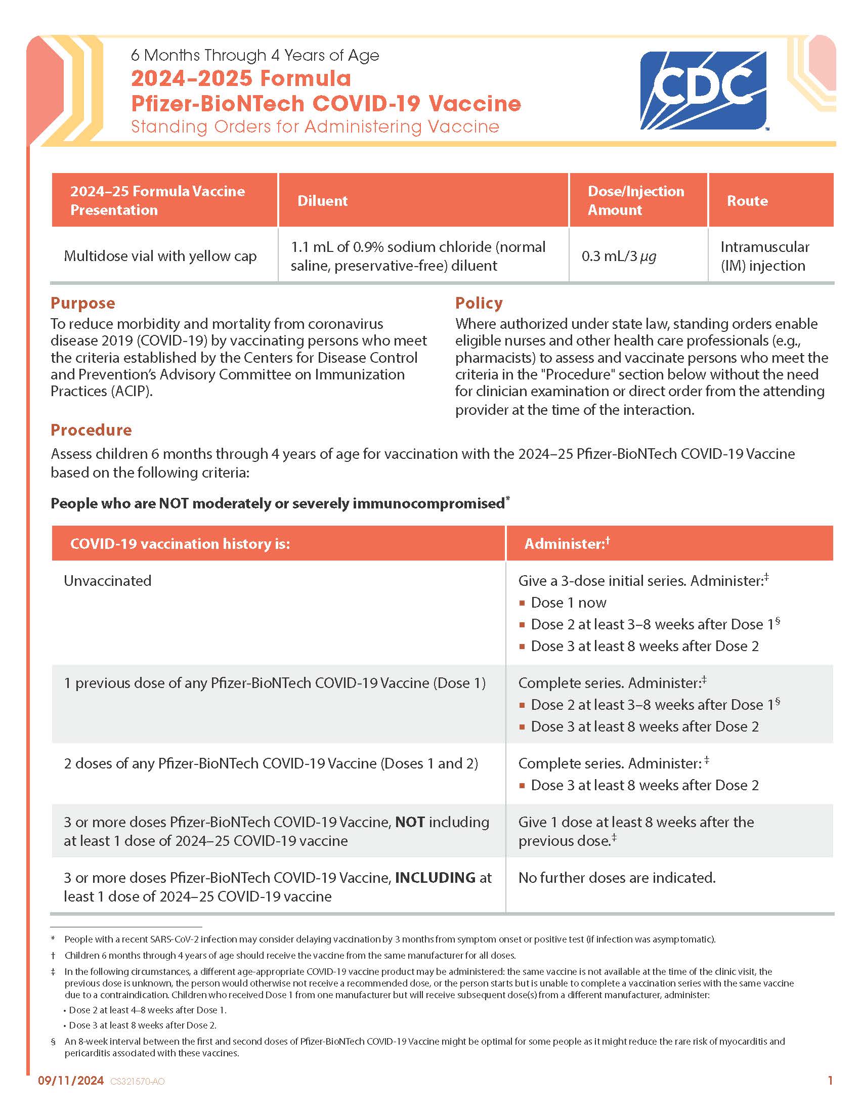 CDC’s form: “6 Months Through 4 Years of Age 2024 – 2025 Formula Pfizer-BioNTech COVID-19 Vaccine Standing Order for Administering Vaccine”