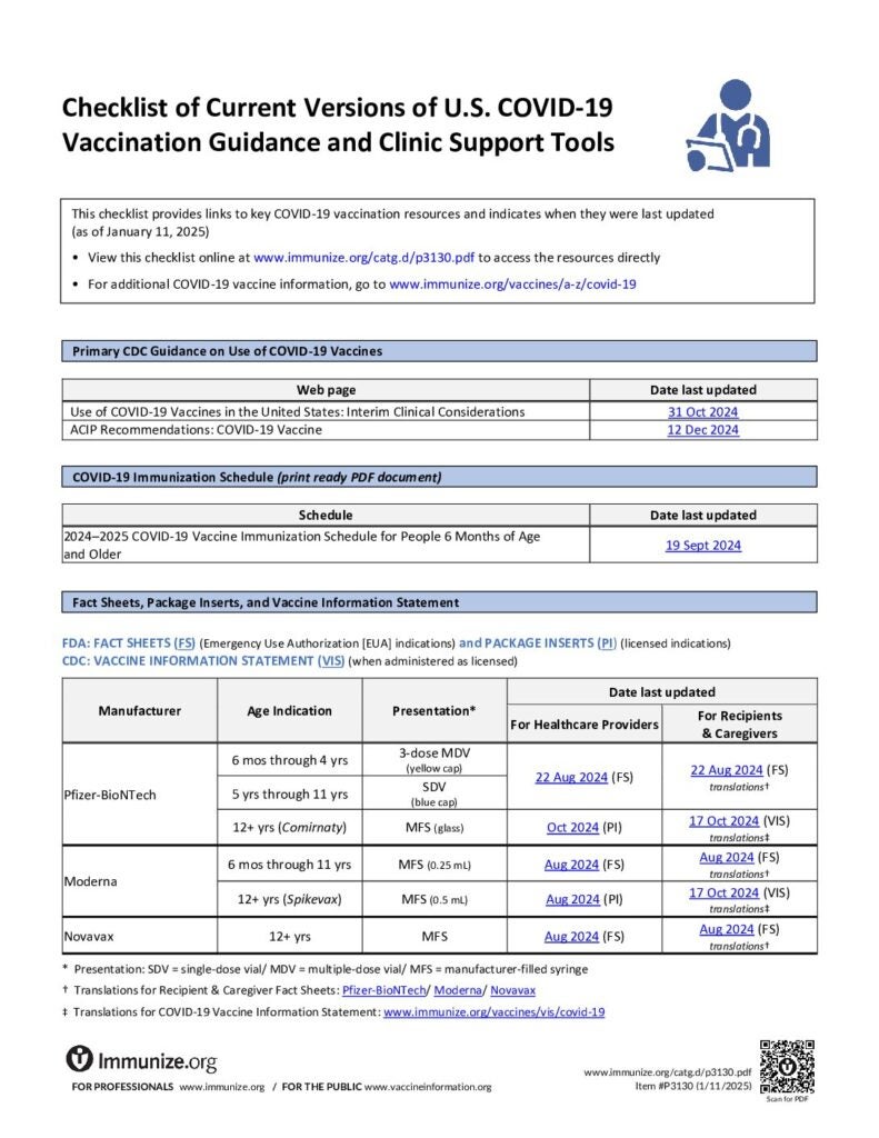 Checklist of links to key COVID-19 vaccination resources, including the date they were last revised.