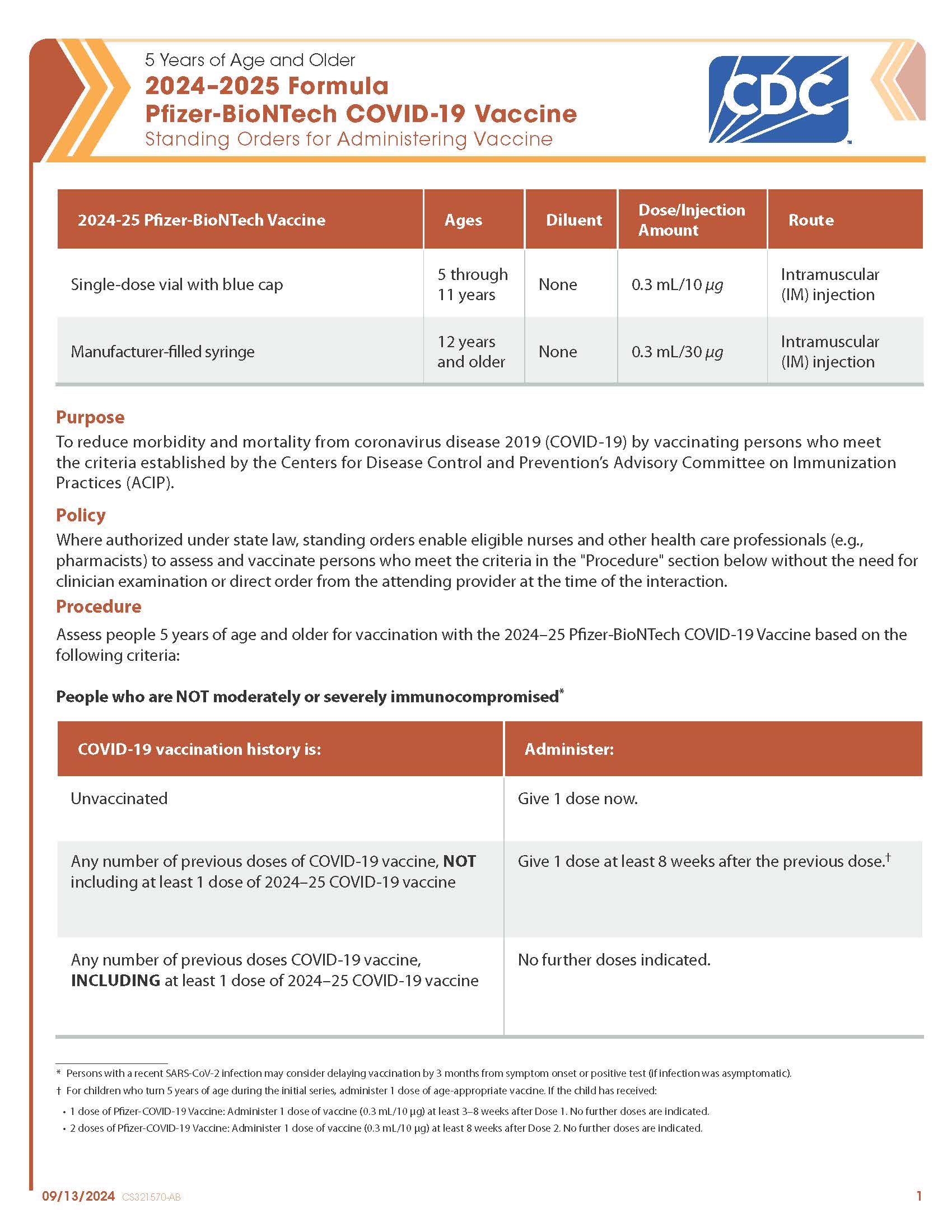 CDC’s form: “5 Years of Age and Older 2024–2025 Formula Pfizer-BioNTech COVID-19 Vaccine Standing Orders for Administering Vaccine”